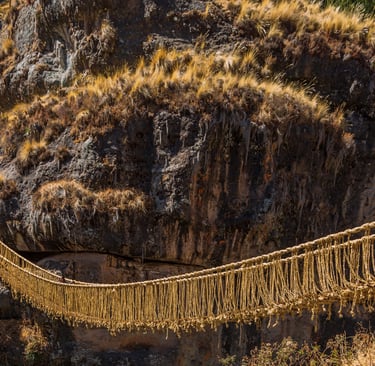 Located high in the Andes (around 3,700 m / 12,100 ft), the Q’eswachaka bridge spans the deep canyon of the Apurímac River. Made from ichu grass and crafted using ancestral techniques, this handwoven suspension bridge is one of the last of its kind — a living relic of the Qhapaq Ñan, the vast Inca road network.