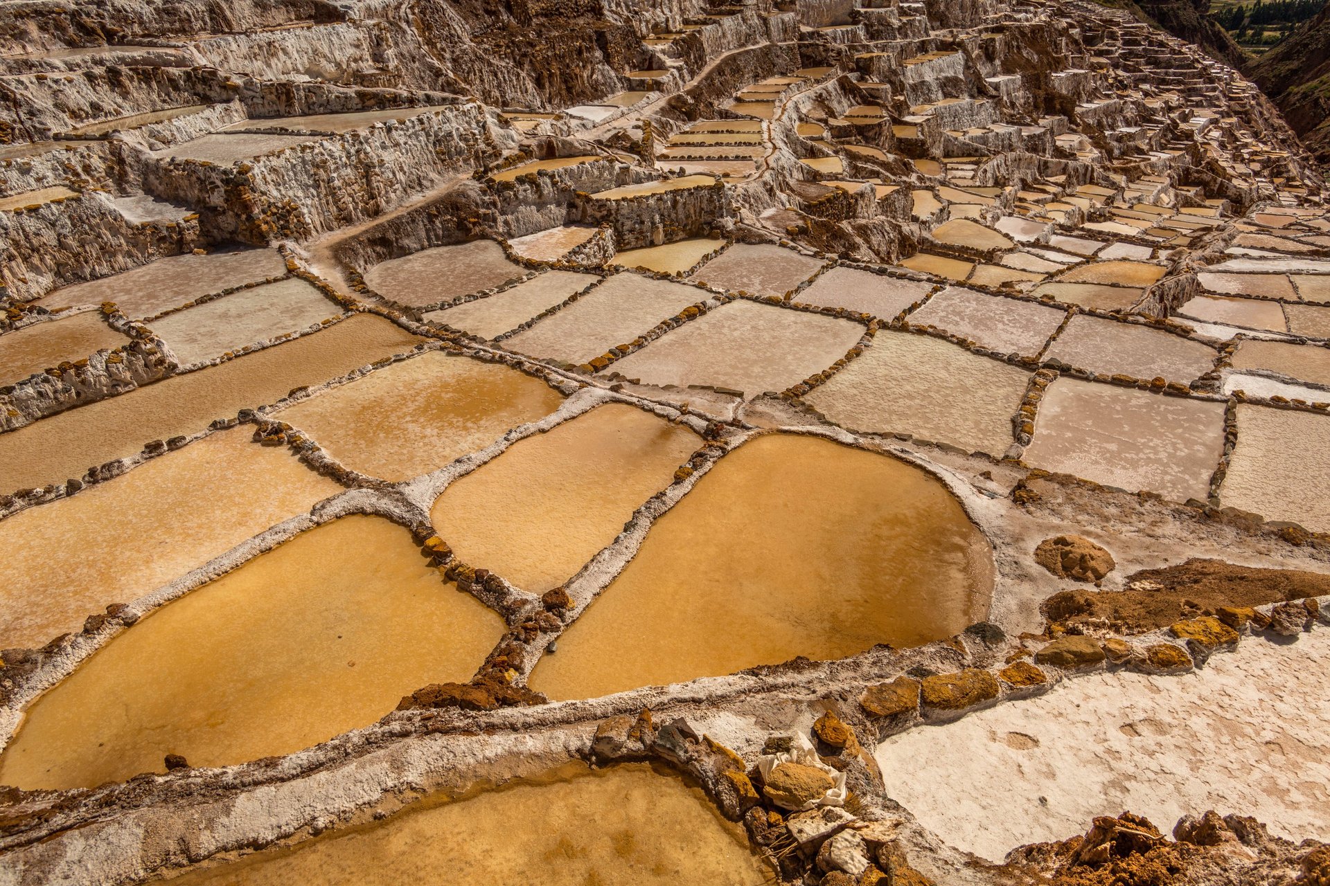 Continuing on our journey to the colonial town of Maras, we look down onto the pre-Inca salt “mines,” called salineras in Spanish. Thousands of salt pans have been passed down through countless generations and used for salt extraction since before Inca times. A hot spring at the top of the valley discharges a small stream of heavily salt laden water, which is diverted into salt pans and evaporated to produce salt. This is one of the few places in the world where you can find naturally pink salt!